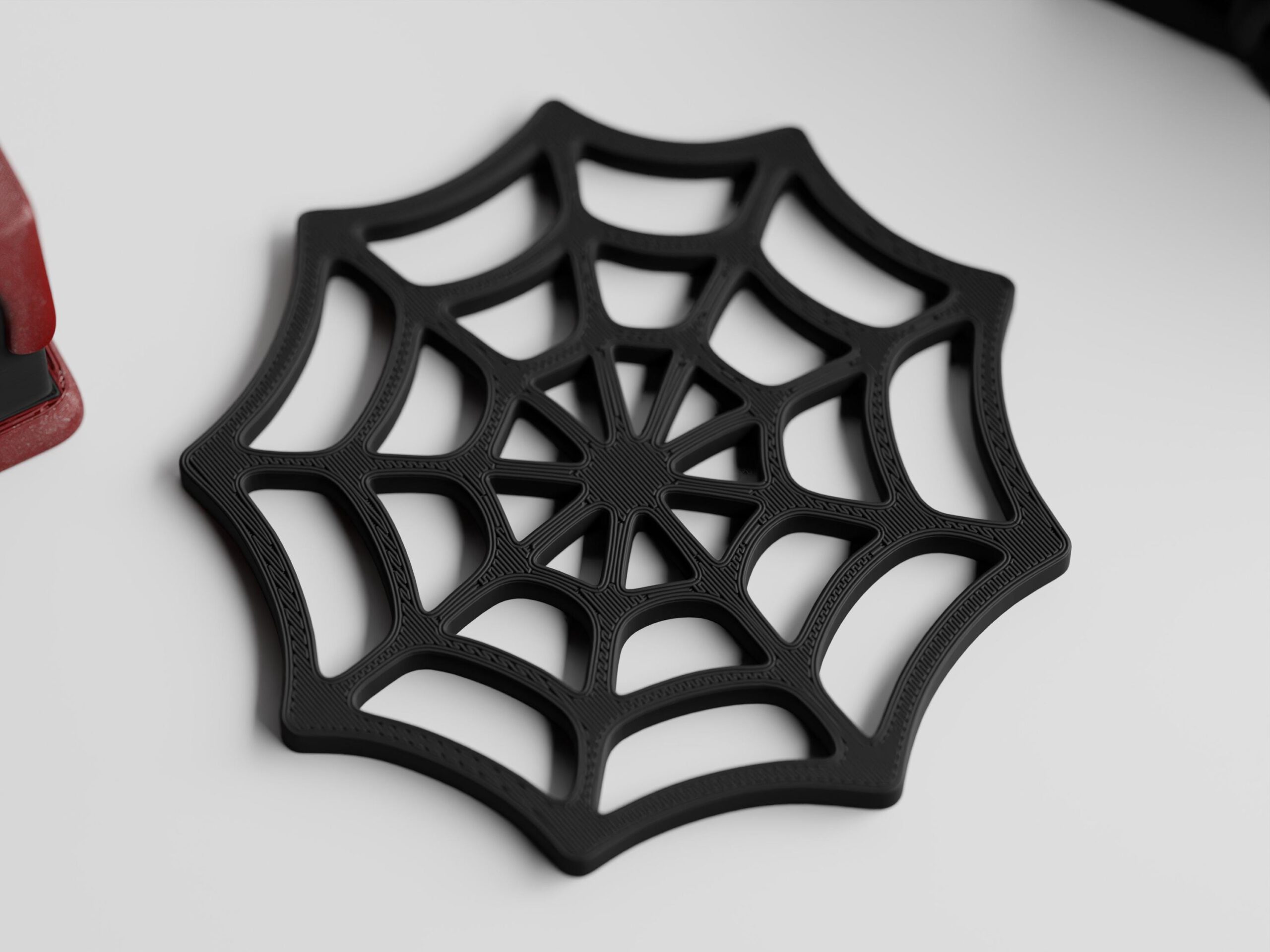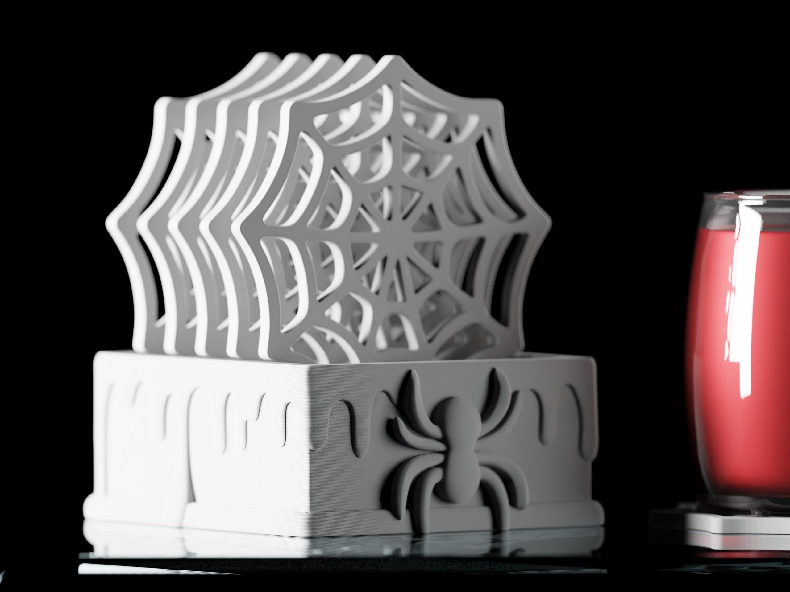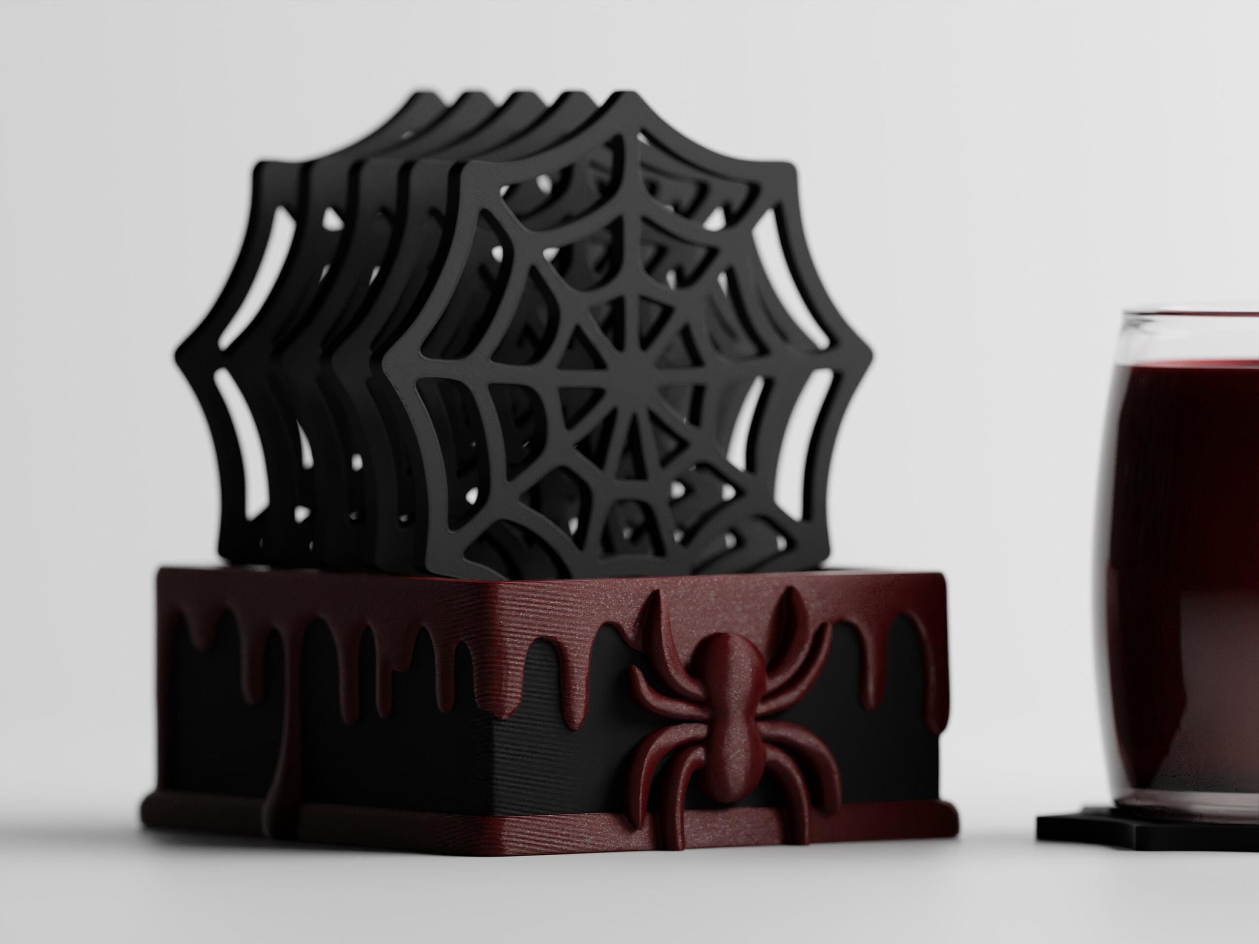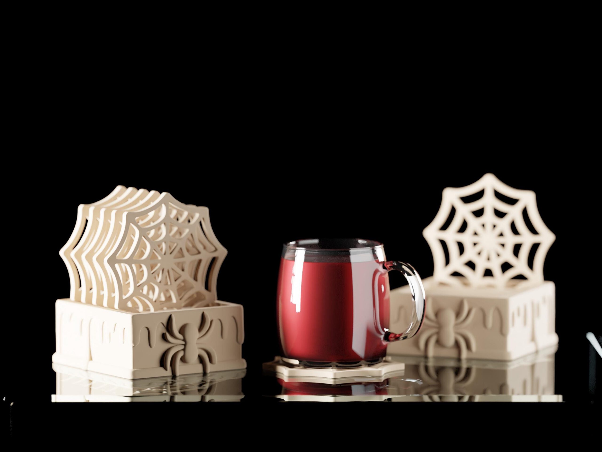 Komplettes Set mit Spinnennetz-Untersetzern, die perfekt in die Basis passen